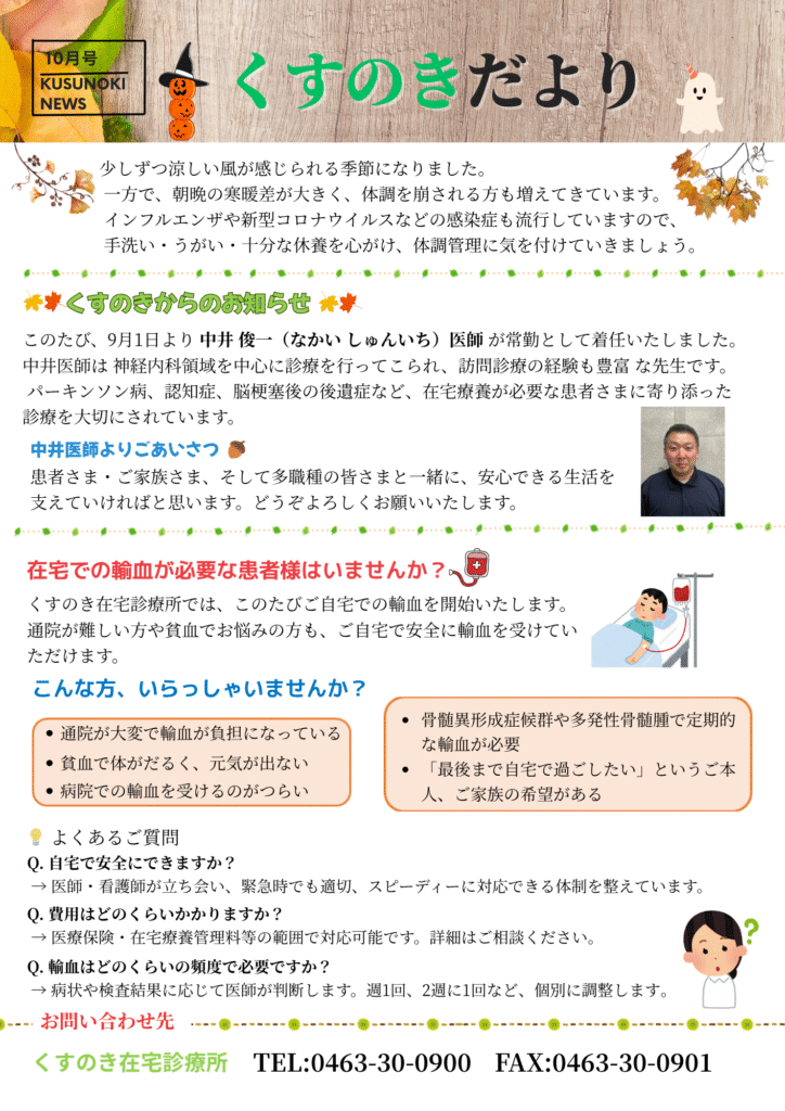 ”くすのきだより10月号”のお知らせになります!今月は「在宅での輸血」についてご紹介しています。