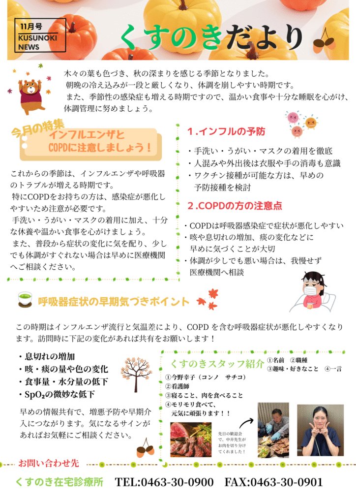 くすのきだより11月号🍂 こんにちは!くすのき在宅診療所の広報担当です。当院のホームページをご覧いただき、ありがとうございます。”くすのきだより11月号”のお知らせになります!今月は「インフルエンザとCOPDの注意ポイント」についてご紹介しています。本格的に寒くなってきましたので、体調管理に気をつけてお過ごしください🌿
